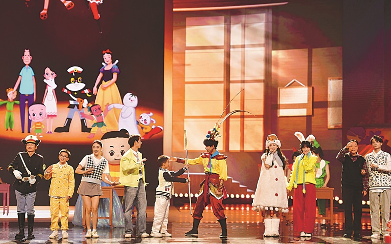 兒童文學以圖畫、書本、聲音、影像等不同形式進入我們的生活,很多兒童文學作品也被改編成動畫片,成為一代代中國人的童年記憶。創意音樂秀《陪我長大的朋友》中,李維嘉、吳昕、鄭方一等十幾位嘉賓扮演成黑貓警長、哪吒、孫悟空、小王子、雪孩子、白雪公主、灰姑娘、葫蘆兄弟、小紅帽等動畫形象,從書型舞臺布景中“穿越”而來,帶領觀眾重溫童年的無憂無慮,呵護心底的天真幻想。